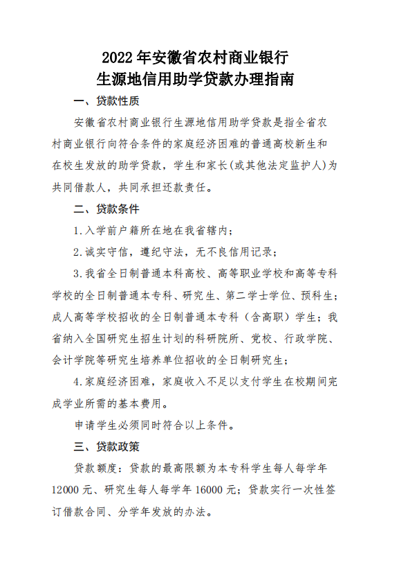 2022年安徽省農村商業銀行生源地信用助學貸款辦理指南