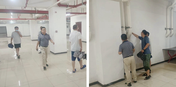 俞浩一行冒雨先後查看了大學生活動中心、9#11#公寓地下室的應急排水系統、防汛物資準備情況及防洪沙袋的配備情況,随後到1#-3#教學樓查看屋頂的防水情況。俞浩現場詳細了解了夏季校園防汛工作的準備和落實情況。