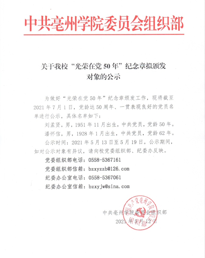 關于我校“光榮在黨50年”紀念章拟頒發對象的公示