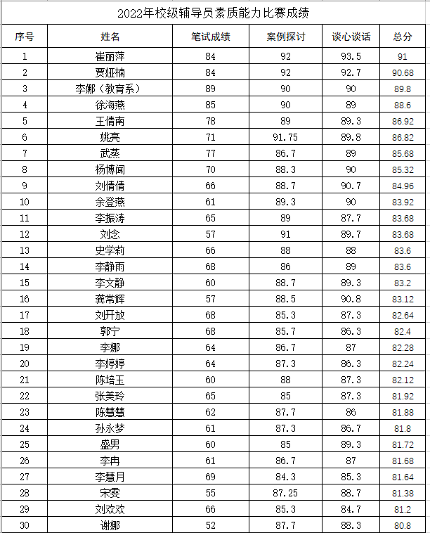 根據《金年会關于開展2022年輔導員素質能力大賽的通知》文件要求,現将2022年校級輔導員素質能力大賽比賽成績予以公示,若有異議,請撥打電話或直接向學生處反映。